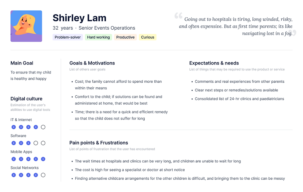 From my research, I narrowed my user persona down to designing for Shirley, a working mother who does not fancy trips to the hospital or clinic.